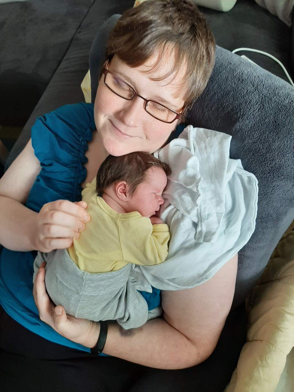 Ich bin an Gelenkrheuma, Weichteilrheuma, sowie an einer degenerativen Wirbelsäulen Erkrankung, erkrankt. Außerdem habe ich 2 komplett kaputte Knie. Als ich 2018 schwanger wurde, hatte ich gerade mal keine Gewichtsprobleme und war körperlich in einer guten Verfassung. Ich bin seit 2011 Frührentnerin. Nach der Schwangerschaft habe einen Pflegegrad 2, sowie einen Schwerbehindertenausweis mit 80% bekommen. Ich bin in Schmerztherapie. Ich habe im Januar 2022 einen Neurostimulator von Nevro gegen meine krassen Nervenschmerzen implantiert bekommen. Der Grund war der in der Schwangerschaft bedingte Bandscheibenvorfall. Dieser musste als Rebecca Ronja geboren war, 3,5 Monate später operiert werden.