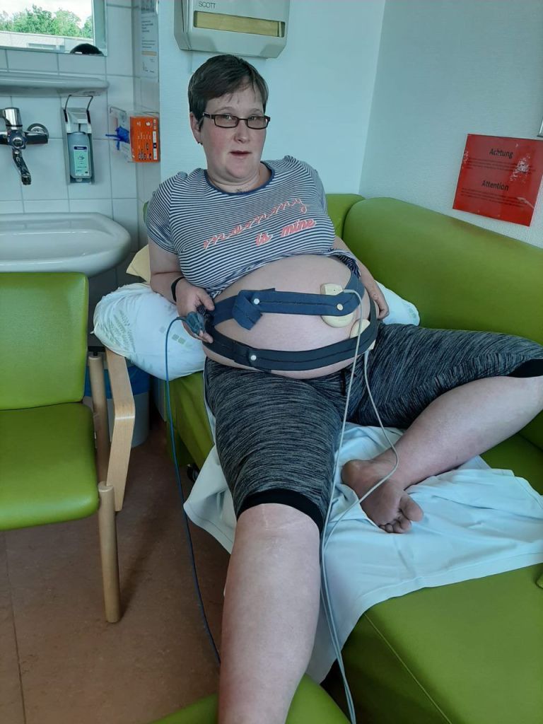 Leider führten die Schwangerschaftshormone dazu, dass meine Bänder schlaff wurden. Ab der 12. SSW hatte ich wieder mehr Symptome. Ab der 19. SSW lag ich aufgrund von Symphysen Lockerung und einem akuten Bandscheibenvorfall in der Lendenwirbelsäule im Bett. In der 21. SSW fingen dann Schwangerschaftdiabetes an und auch eine tiefliegende Plazenta wurde diagnostiziert. Also lag ich bis zu 31. SSW zu Hause und musste ab da an alle 2 Wochen zum Ultraschall und CTG. Ab der 31. SSW jede Woche und in der 35. SSW wurde ich stationär aufgenommen. Ich hatte mir sogar privat ein kleines CTG für zuhause gekauft. So konnte ich, wenn sie sich nicht bewegte, hören, ob ihr Herz noch schlägt.